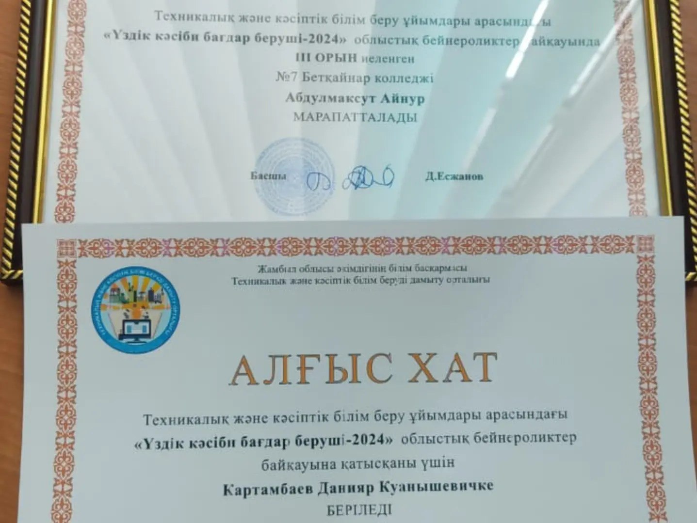 Техникалық және кәсіптік білім беру ұйымдарында «Үздік кәсіби бағдар беруші - 2024» облыстық бейнероликтер байқауы өтті. 2024 жылдың 10 сәуір күні Жамбыл облысы әкімдігінің білім басқармасының техникалық және кәсіптік білім беруді дамыту орталығының ұйымдастыруымен ТжКББ ұйымдарындағы педагогтердің қоғамдық маңызы бар кәсіби бағдар беру қызметіне шығармашылық көзқарасын жандандыру, аймақтық еңбек нарығының мүдделерін ескере отырып колледж мамандықтарын дәріптеу және колледждер арасында үздік кәсіби бағдар жұмысын анықтау мақсатында «Үздік кәсіби бағдар беруші - 2024» бейнероликтер байқауының марапаттау рәсімі өтті. Аталған облыстық байқауға қатысуға 31 қатысушы өтінім беріп, әлеуметтік желілерге орналастырған бейнероликтерін комиссия мүшелері бағалау қорытындылары бойынша 7 Бетқайнар колледжінің әдіскері Абдулмақсут Айнур III орынды иеленді. Директордың тәрбие жұмысы жөніндегі орынбасары Картамбаев Данияр Куанышұлы байқауға қатысқаны үшін "Техникалық және кәсіптік білім беруді дамыту" орталығы басшысының алғыс хатымен марапатталды. Құттықтаймыз!!!