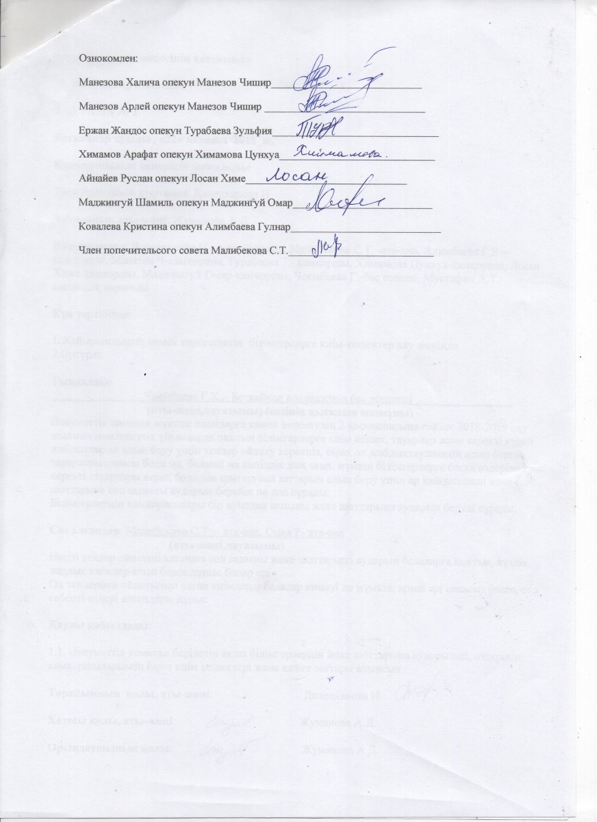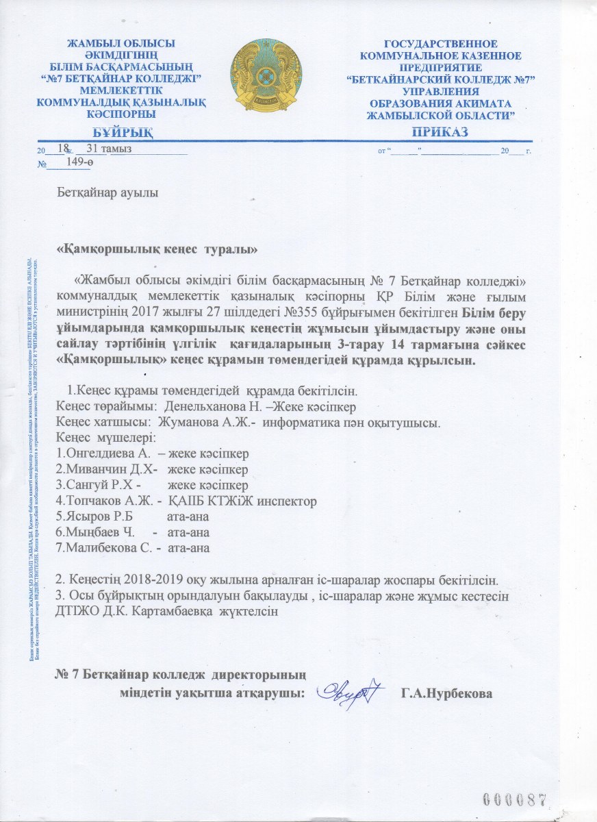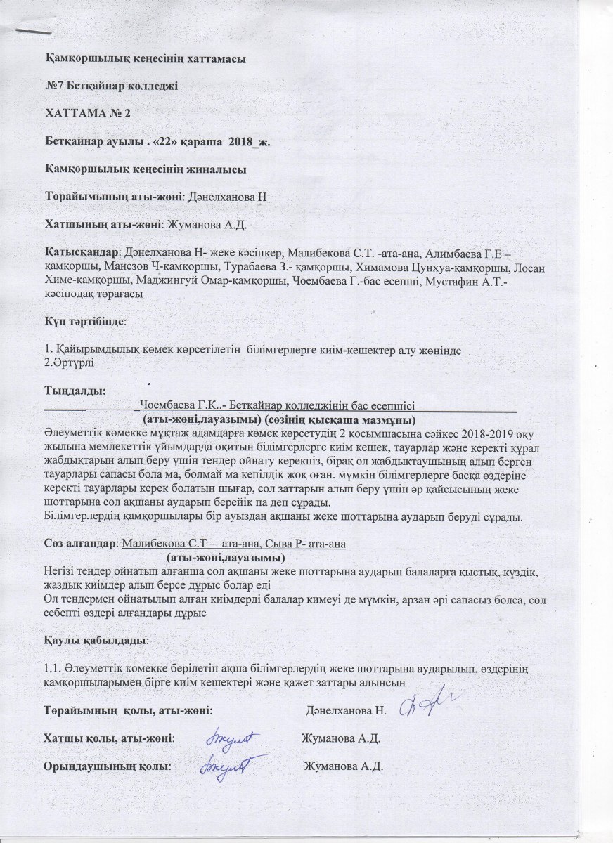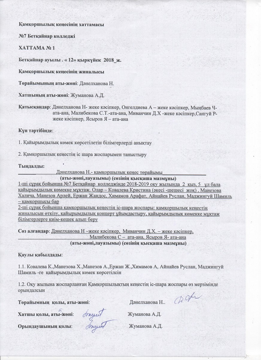 Білім беру ұйымдарында қамқоршылық кеңестің жұмысын ұйымдастыру және оны сайлау тәртібінің үлгілік қағидаларының 3- тарау 14 тармағына сәйкес № 7 Бетқайнар колледжінде «Қамқоршылық кеңесі» құрылды. Кеңес мүшелері 9 адам.