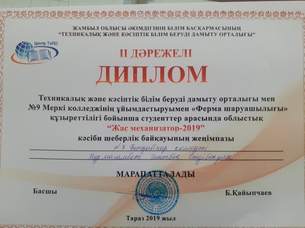 №7 Бетқайнар колледжінен Нұрмагамбет Әметбек Сәндібекұлы І І дәрежелі дипломмен және сыйлықпен марапатталды.