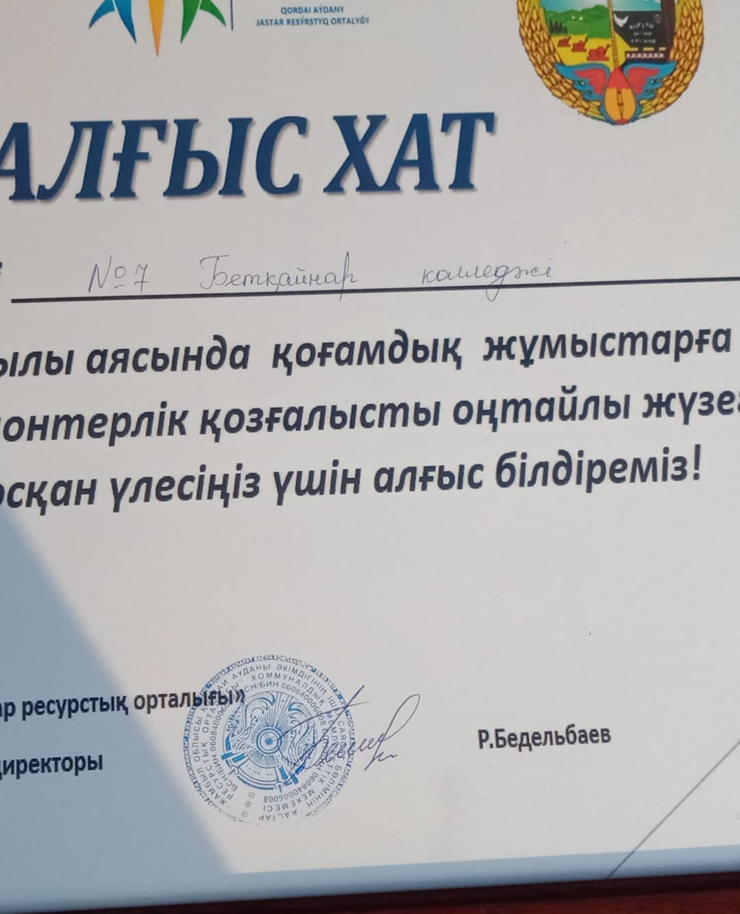 Еріктілер жылы аясында қоғамдық жұмыстарға белсене қатысып, волонтерлік қозғалысты оңтайлы жүзеге асуына қосқан үлесі үшін Бетқайнар колледжі марапатталды.