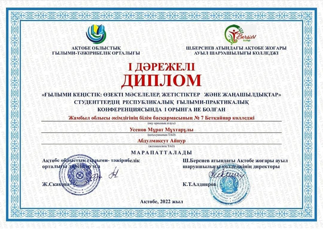 І РЕСПУБЛИКАНСКОЙ НАУЧНО - ПРАКТИЧЕСКОЙ КОНФЕРЕНЦИЯ СТУДЕНТОВ «НАУЧНОЕ ПРОСТРАНСТВО: АКТУАЛЬНЫЕ ПРОБЛЕМЫ, ДОСТИЖЕНИЯ И ИННОВАЦИИ" ПО НАПРАВЛЕНИЮ СЕЛЬСКОХОЗЯЙСТВЕННЫХ НАУК: БЕТКАЙНАРСКИЙ КОЛЛЕДЖ № 7 УПРАВЛЕНИЯ ОБРАЗОВАНИЯ АКИМАТА ЖАМБЫЛСКОЙ ОБЛАСТИ НАГРАЖДЕН ДИПЛОМОМ 1 СТЕПЕНИ ОБУЧАЮЩИЙСЯ 3 КУРСА СПЕЦИАЛЬНОСТИ "ФЕРМЕРСКОЕ ХОЗЯЙСТВО" УСЕНОВ МУРАТ МУХТАРОВИЧ. НАУЧНЫЙ РУКОВОДИТЕЛЬ АБДУЛМАКСУТ АЙНУР.